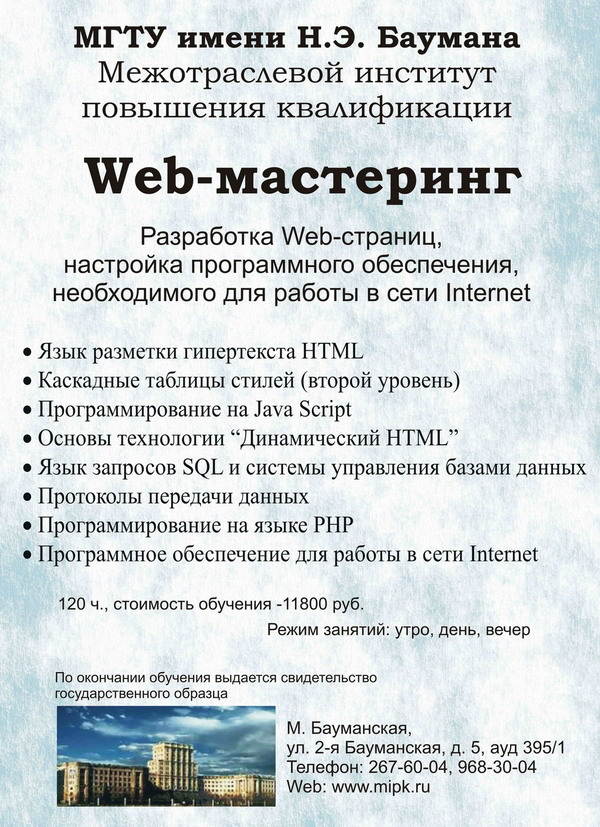Курс готовит слушателей к работе Web-мастера. Изучаются основные приемы построения Web-страниц, в том числе, с использованием современных интерактивных технологий. Слушатели получают знания о взаимодействии Web-серверов с базами данных, что является основой современного электронного бизнеса.